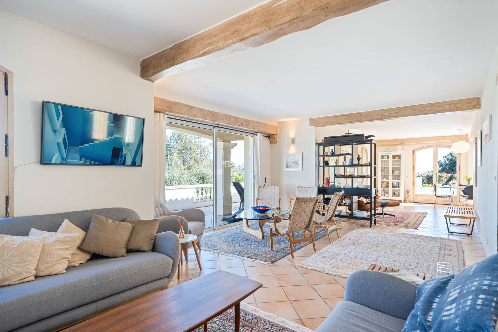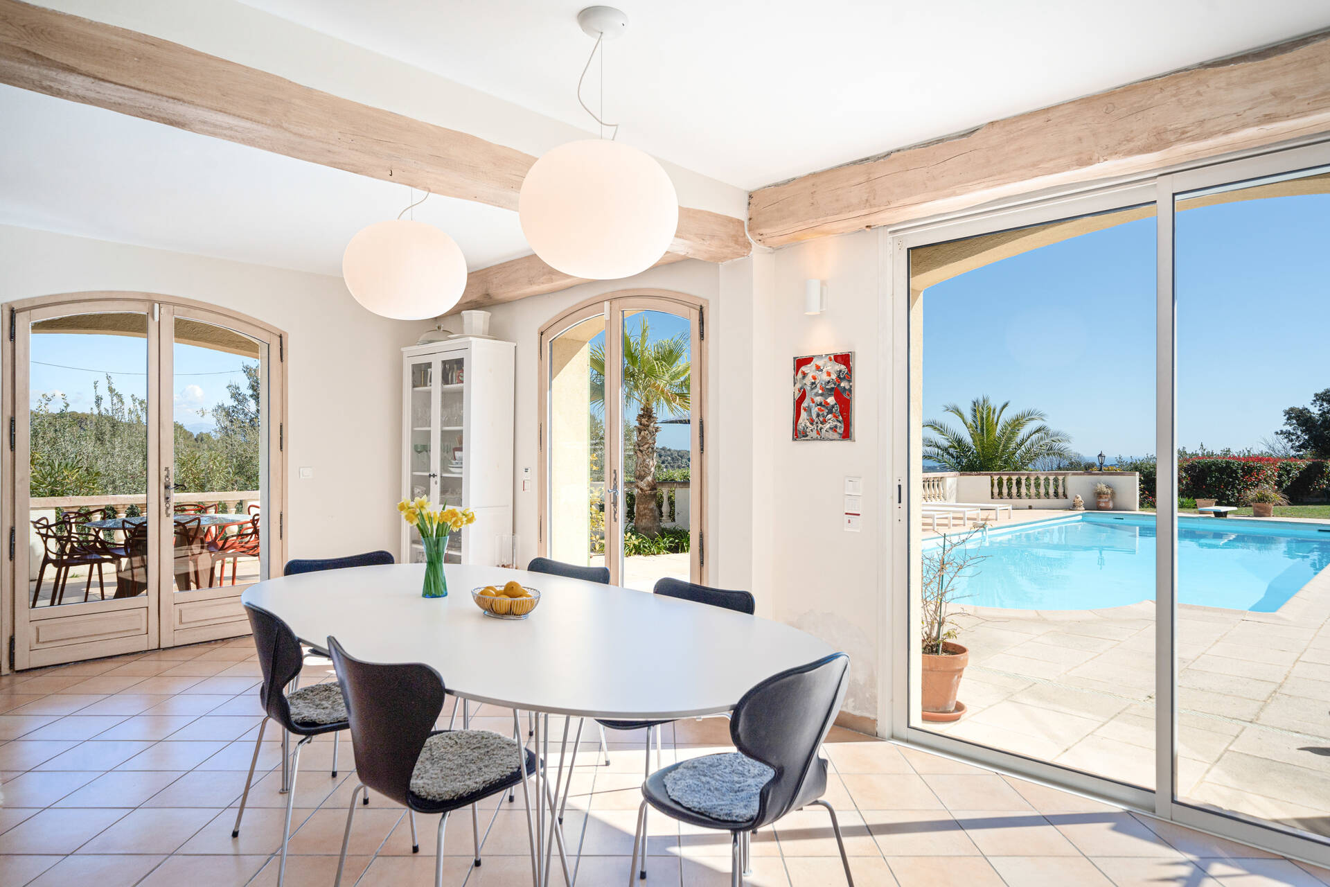 De generösa sällskapsytorna öppnar upp mot trädgården och poolen – den naturliga mittpunkt – och bjuder på enastående utsikt över de omgivande kullarna och havet.